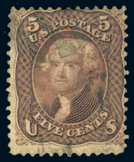 | 75 5¢ Dark Red Brown, Avg, with crease and light ccl cv ($1000)