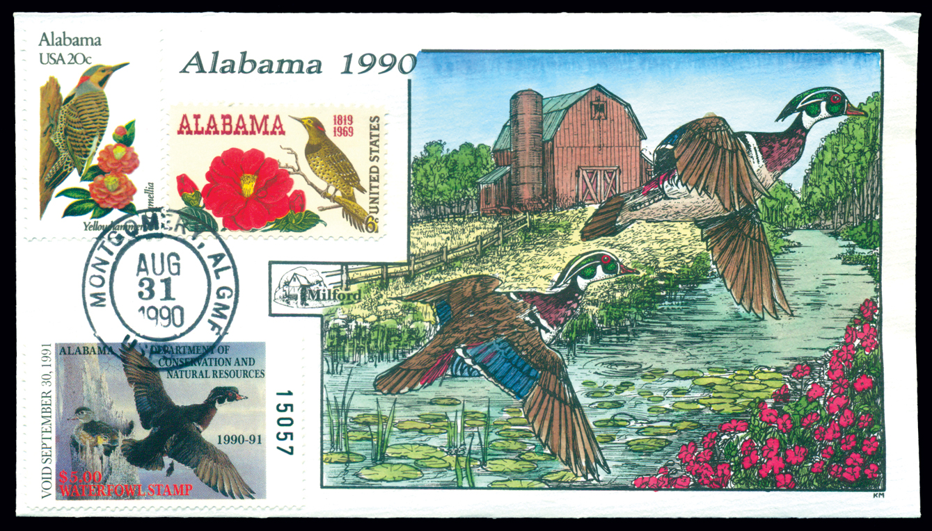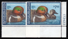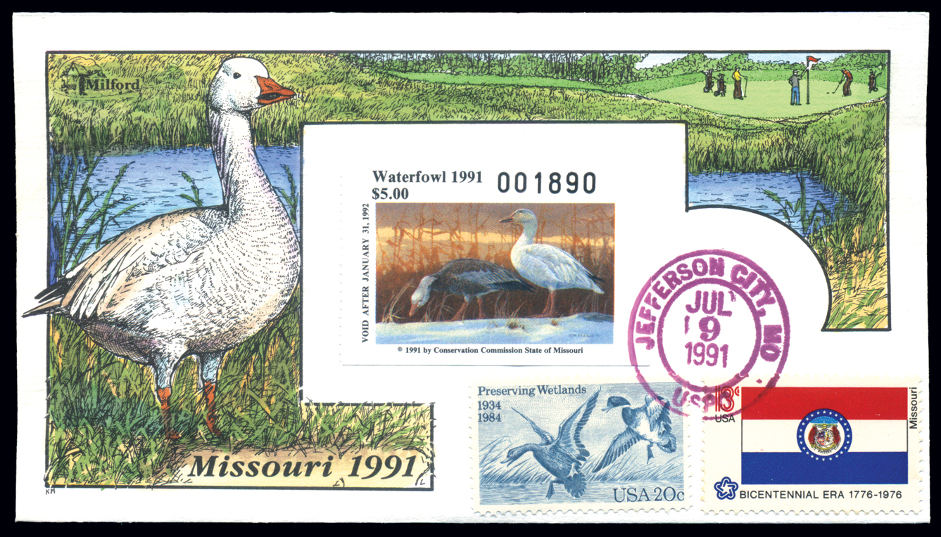 | MO7 Missouri 1985 State Duck Print, sba Ron Clayton, with mint stamp and folio, edition of 1,000, no. 537, American Wigeons