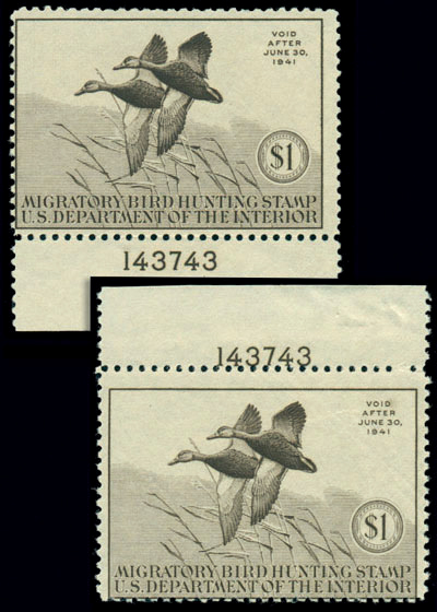 | RW46 1979 Federal Duck Print, Companion Edition, with small conpanion etching of Pintail on water, hand-colored, signed by artist Ken Michaelsen (deceased), no. 67/100 entitled "SPRIG", edition of 1,500, this no. 878. Without stamp or folio; Green-winged Teal. Print has an overall light foxing with some framing discoloration cv ($500)