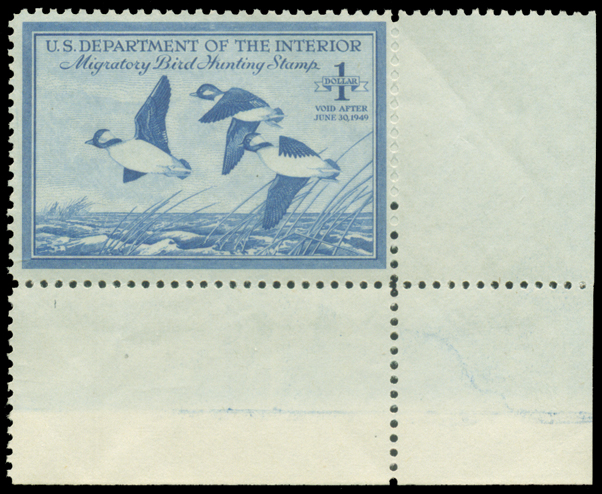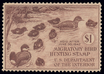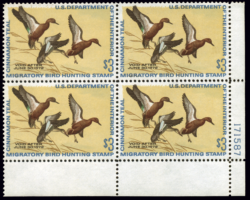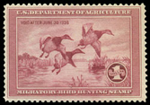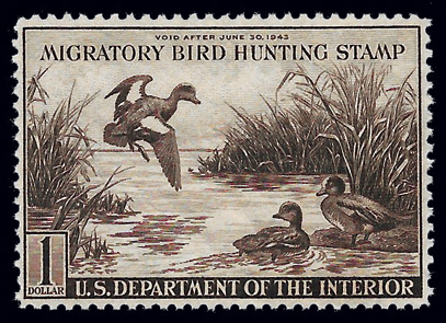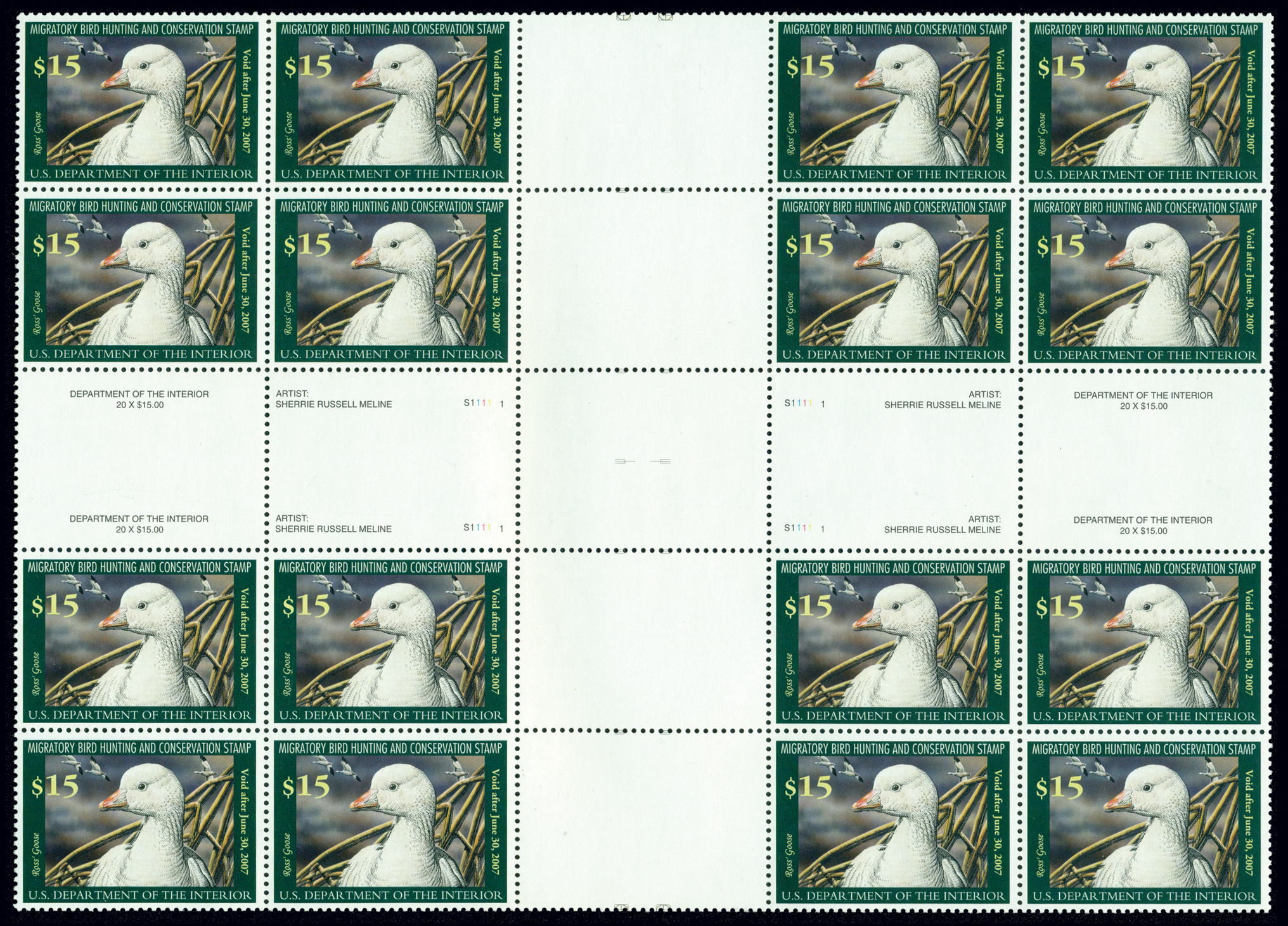 | NWF-1943 #186-222 National Wildlife Federation 1943 Conservation Stamps, Complete Sheet of 64, F-VF NH, sheet is intact with a few flaws, perf separation at points, selvage separation and tear. There are (37) different stamps designed by F.L. Jaques (RW7), Walter Weber (RW11, 17) and Leslie Ryan (noted commercial artist). Cotton catalog cv ($296)