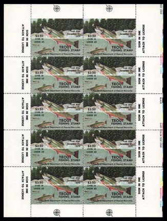 | NJT31-2, 35-6, NJW5 New Jersey Trout and Woodcock, Sheets of 10, F-VF NH, includes 1968 and 1970 Resident and Non-Resident Trout and 1971 Woodcock. Catalog no's from Wooten cv ($500)