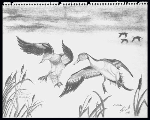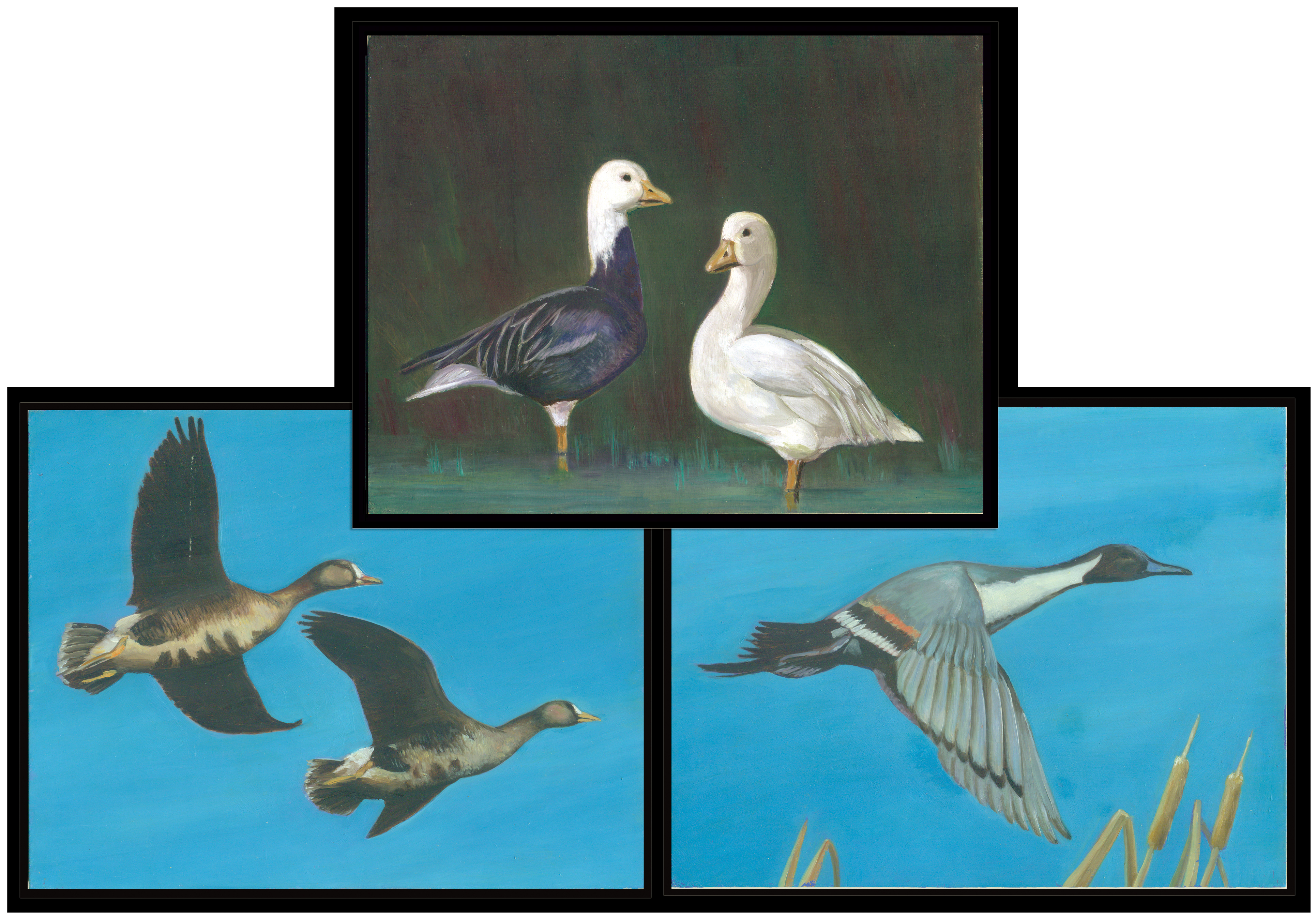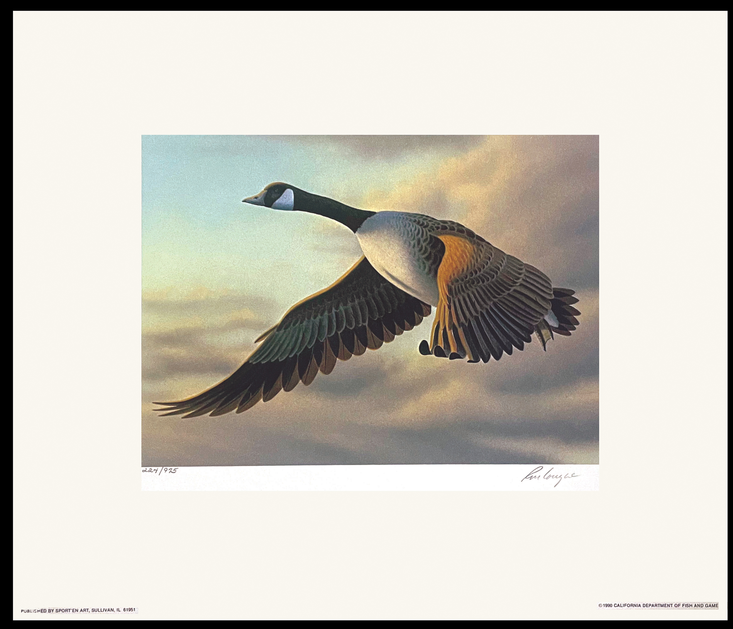 | RW43 1976 Federal Duck Print, Scratchboard Edition, with 2" x 1 3/8" scratchboard of an owl sitting on a limb (light cracking in design), sba Alderson Magee (deceased), without stamp or folio, Canada Geese and goslings, this no. DS 458/1,000 cv ($1300)