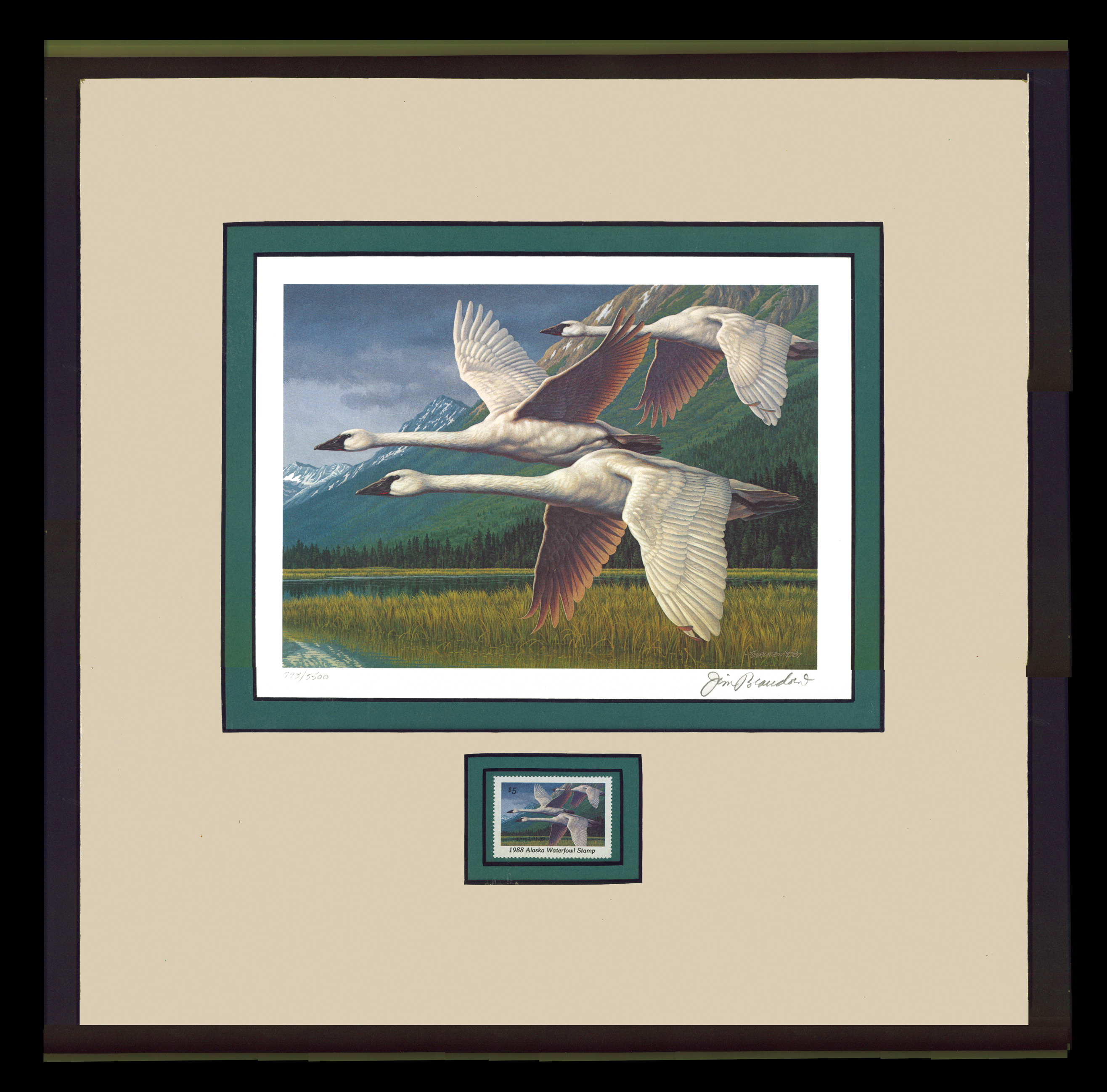 | RW55 1988 Federal Duck Print, with silver and gold medallion, sba Daniel Smith, with AS stamp, edition of 6,500, Snow Geese, mounted in "ripe fig" brown over bluish gray double matting with black trim, shrinkwrapped cv ($285)
